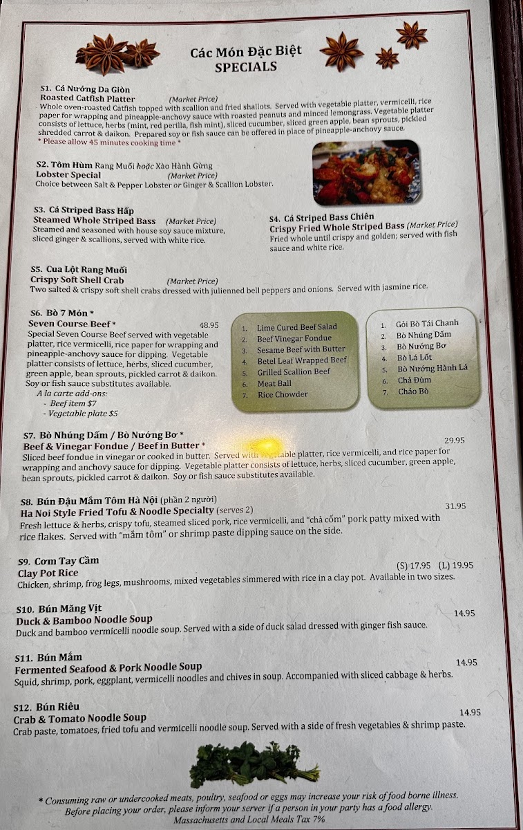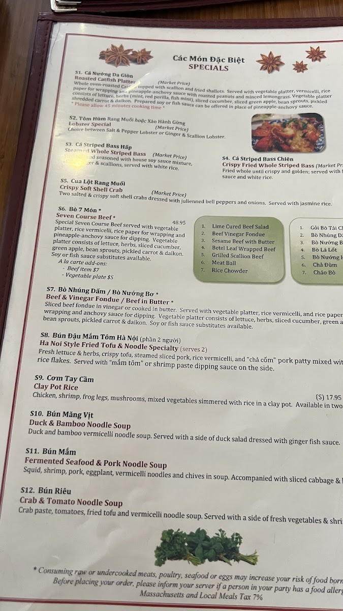 Bò 7 Món... Special Seven Course Beef served with vegetable platter, rice vermicelli, rice paper for wrapping and pineapple-anchovy sauce for dipping. Vegetable platter consists of lettuce, herbs, sliced cucumber, green apple, bean sprouts, pickled carrot & daikon. Soy or fish sauce substitutes available.